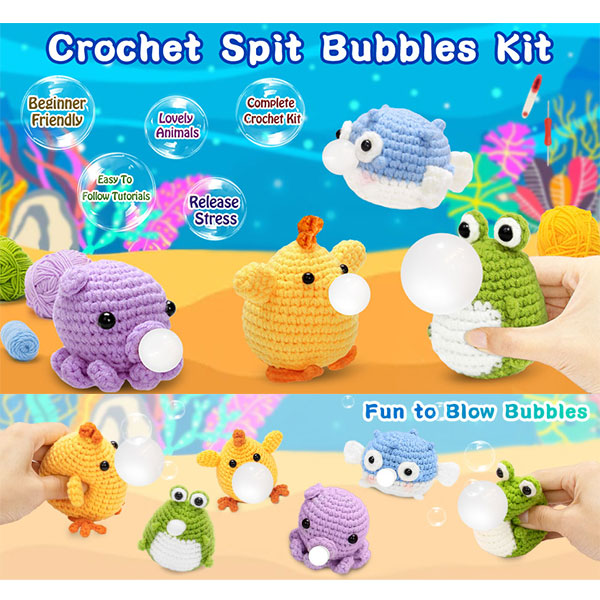 Stress-Relief Fun:Â Squeeze, play, and de-stress with our Spit Bubble Crochet Kit. Craft adorable chicks, puffer fish, octopus, and frogs while relieving stress and captivating audiences.
