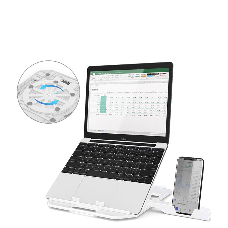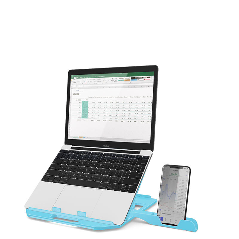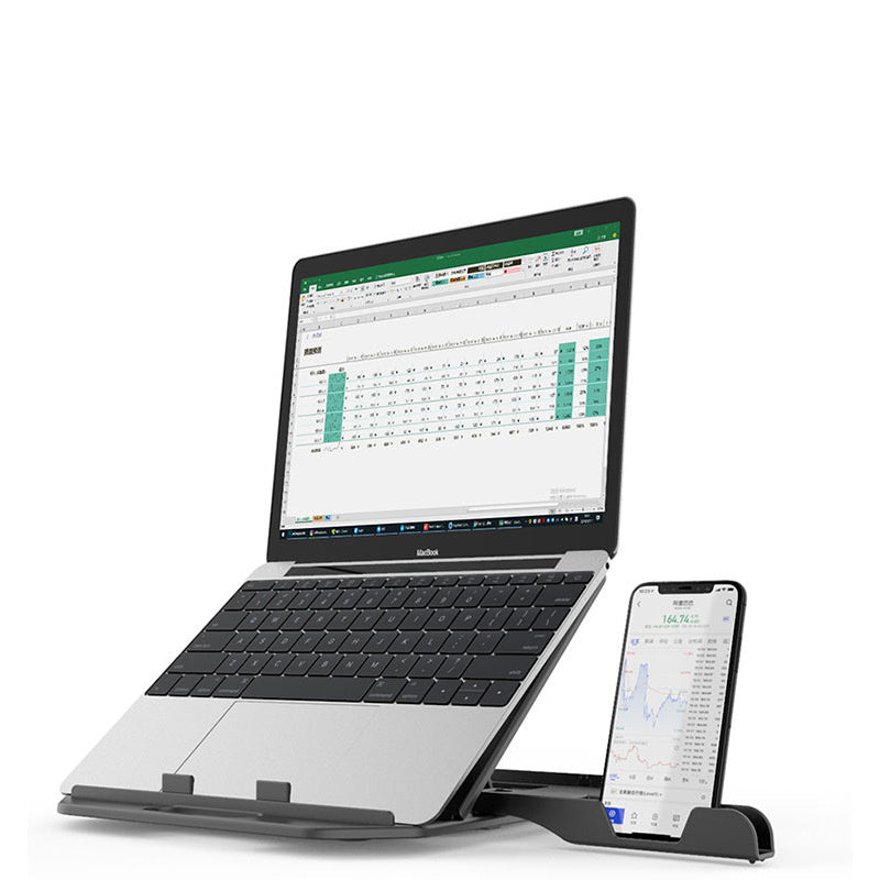 Open the bottom of left and right foot frame, put your laptop on it, the laptop stand can be as a Display height bracket, also can be used for storage keyboard and mouse