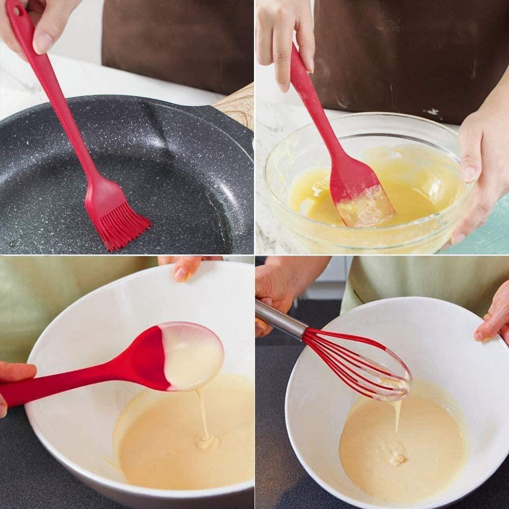 Professional Silicon Kitchen Utensil Set: This set includes spoonula, whisk, spoon, brush, large spatula, small spatula, ladle, slotted turner, tongs, pasta fork. 10 Pcs different utensils to satisfy all your needs in cooking meat, noodles, baking... Making cooking much easier.