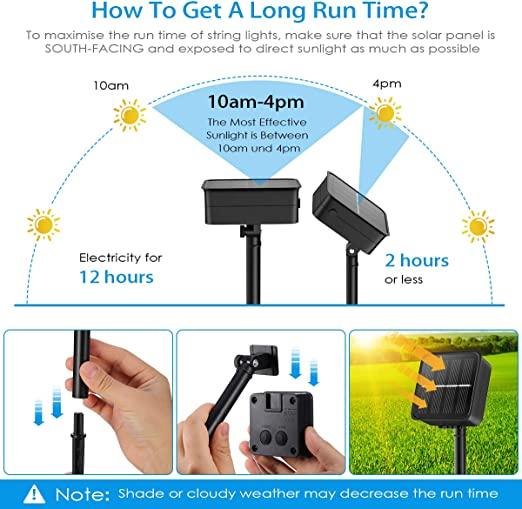 Water Resistant - Both the string lights and the solar panel are IP65 Waterproof. No worry to use them in the rain.