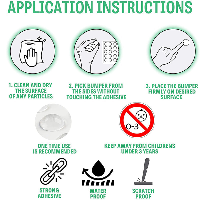High Quality - The cabinet door bumper is made of high quality and eco-friendly silicone, water-proof, non-toxic, safe for the environment. The cabinet door stoppers have a very sticky self-adhesive backing to ensure the bumper stay in place and not easy to fall off