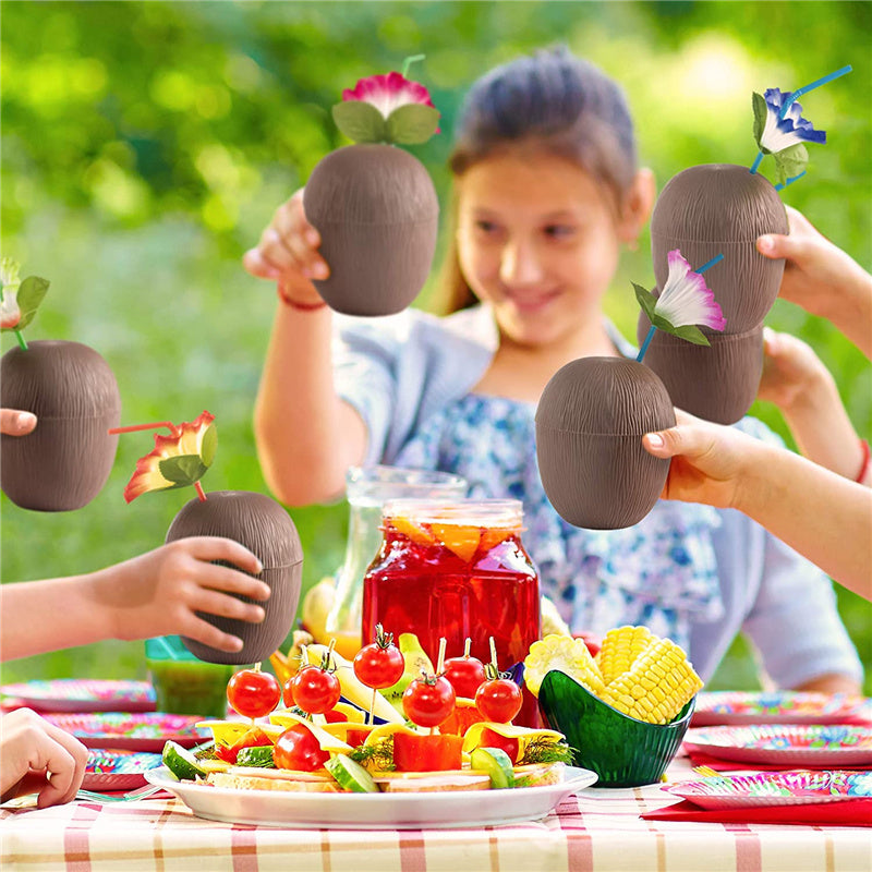 GREAT VALUE COCONUT CUPS & HIBISCUS FLOWER STRAWS: 12 coconut-shaped cups with twist-off lids and assorted color bendable straws with a brightly-colored tropical hibiscus flower for the perfect Luau, Hawaiian, or Beach Inspired Party.