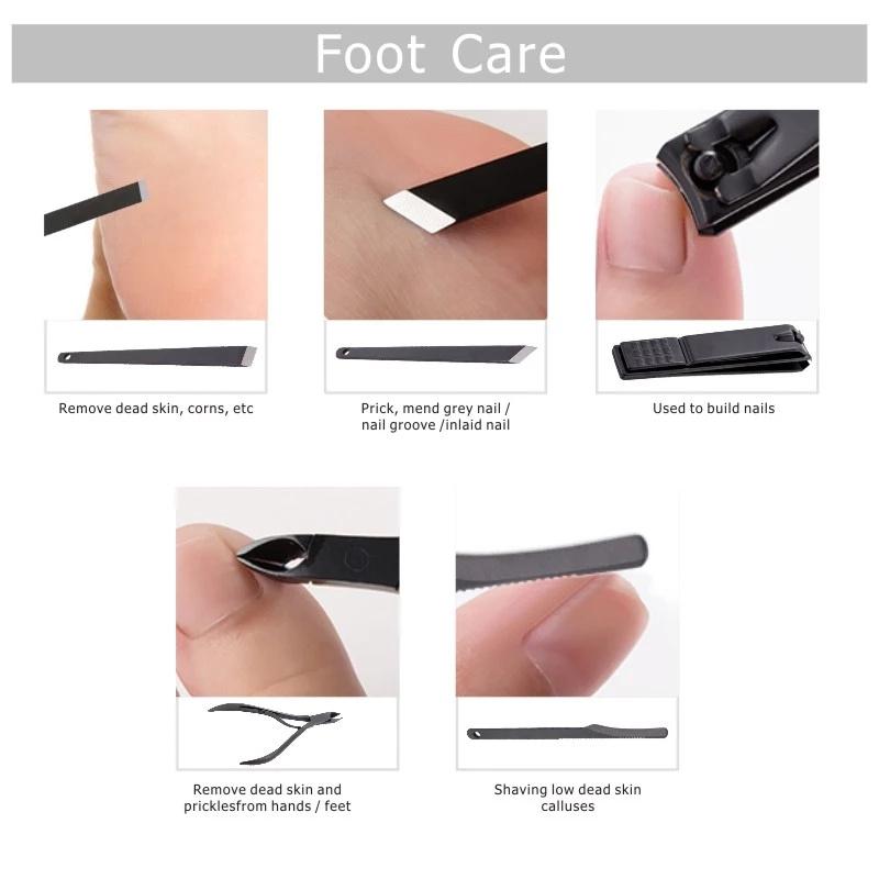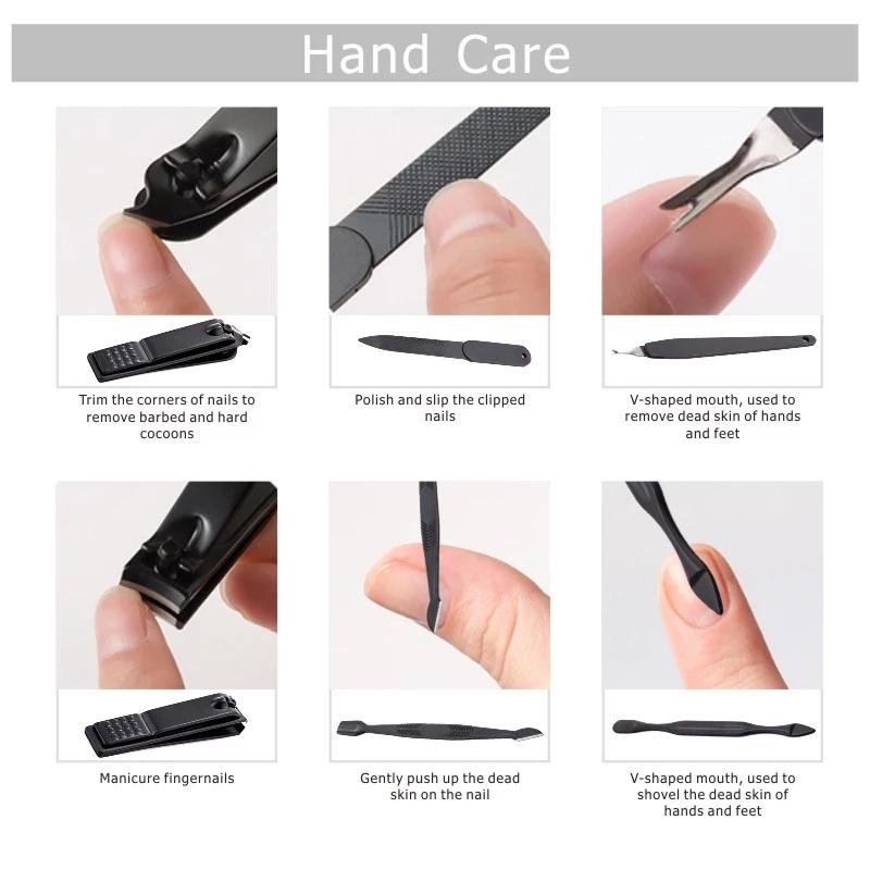 Easy to Use, Better Design: Our nail kit, highlight black tools with a durable and fashion PU leather case. ergonomic design, Very easy to trim thick nails. Our manicure pedicure kit are not only good-looking in appearance and packaging, but also its quality details. The handle has the corresponding grain which is not easy to slide off, Waterproof and and never rust. nail scissors nail clippers set fingernail black manicure set cutters.