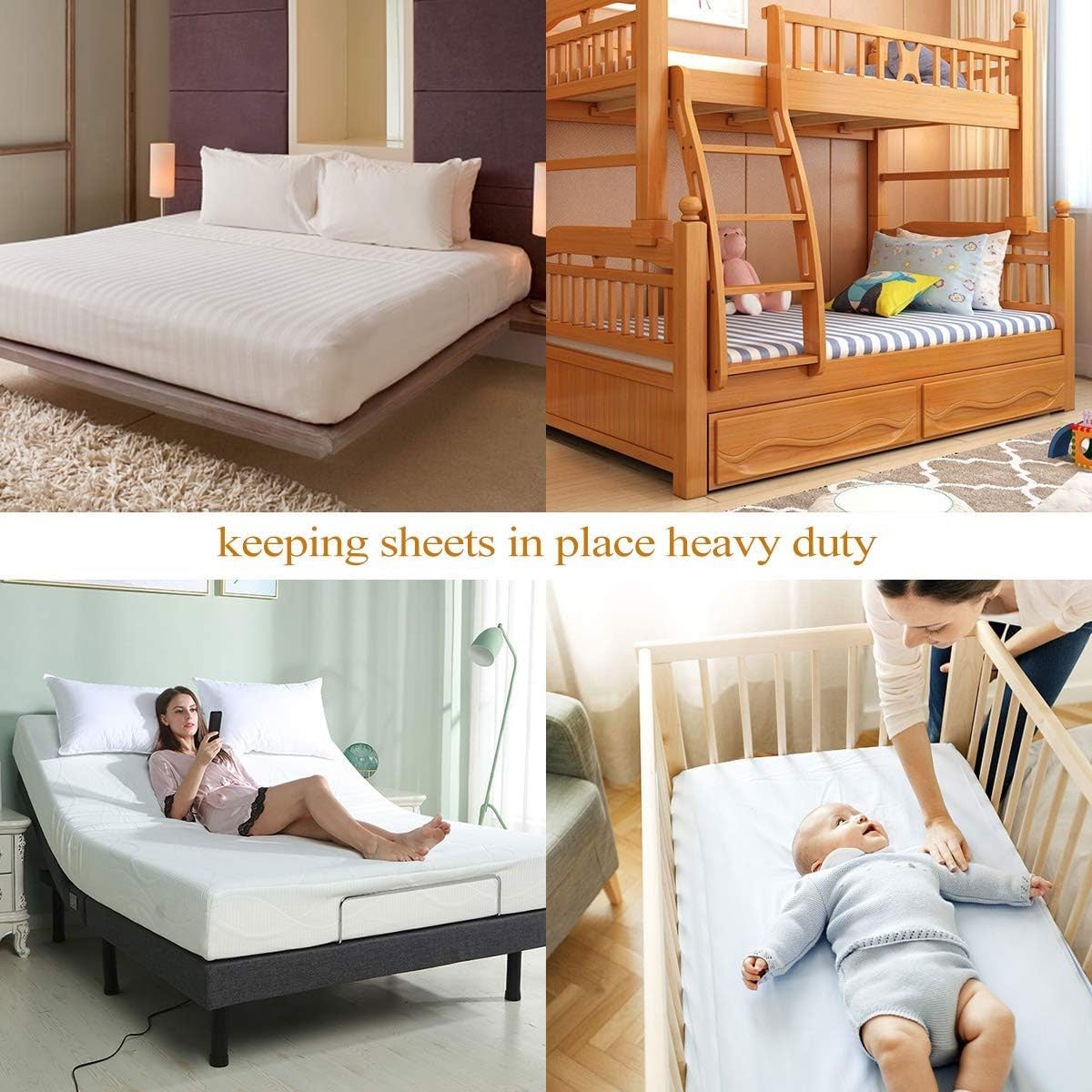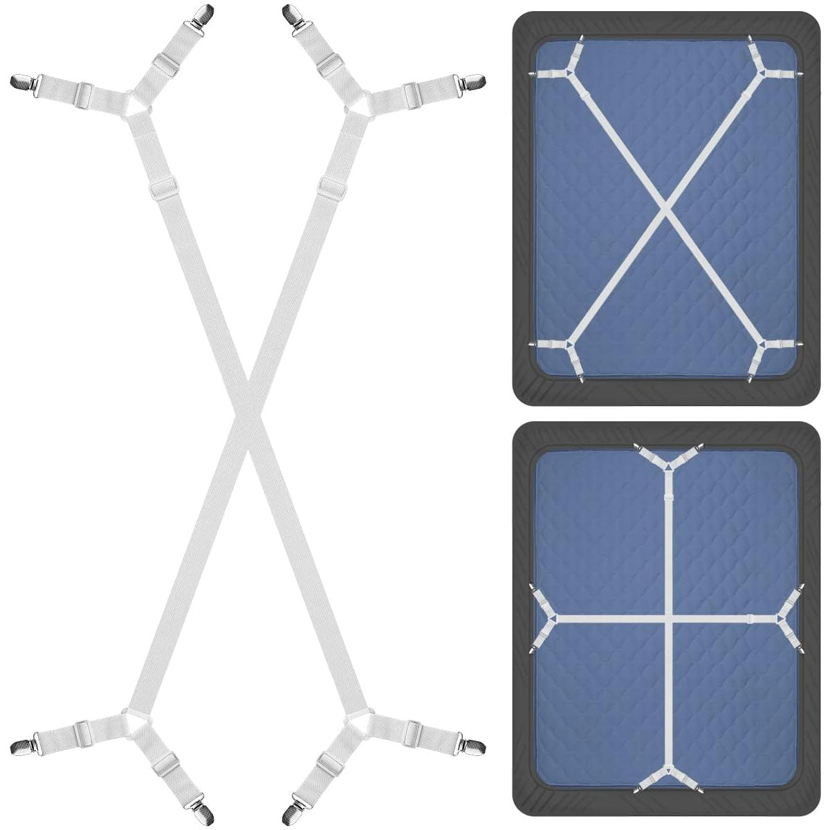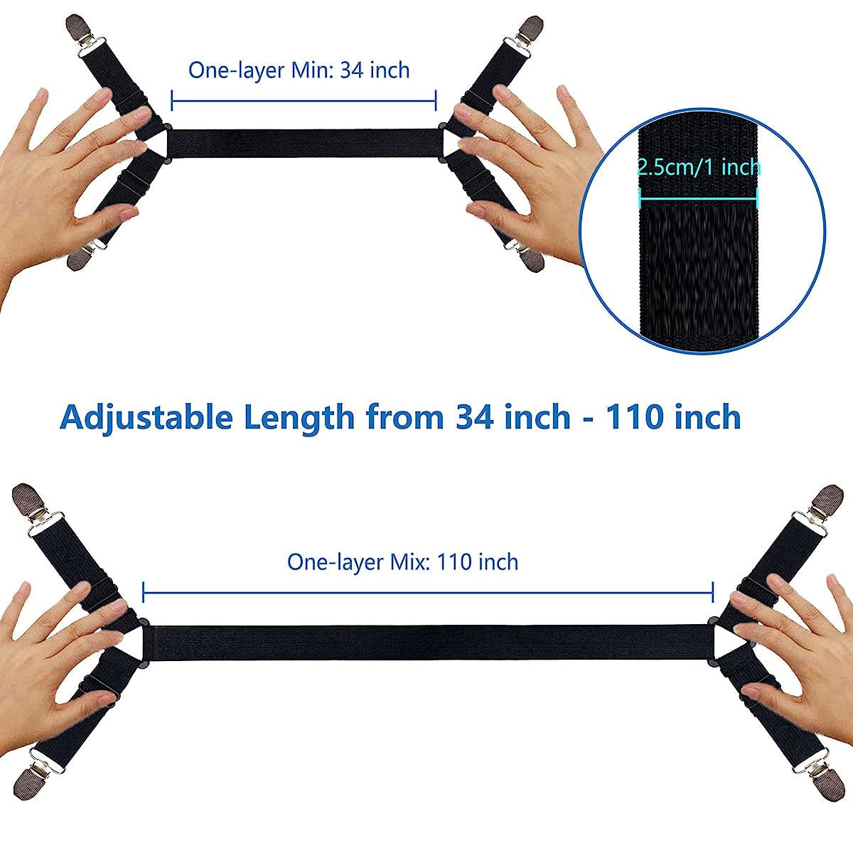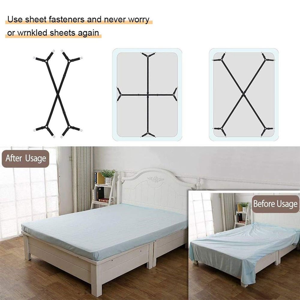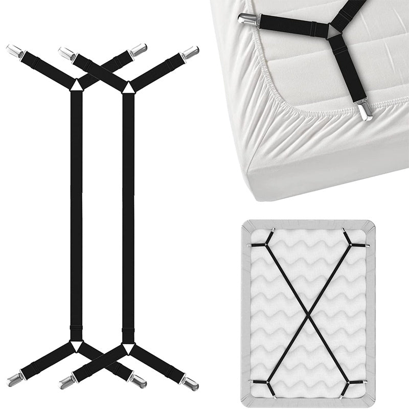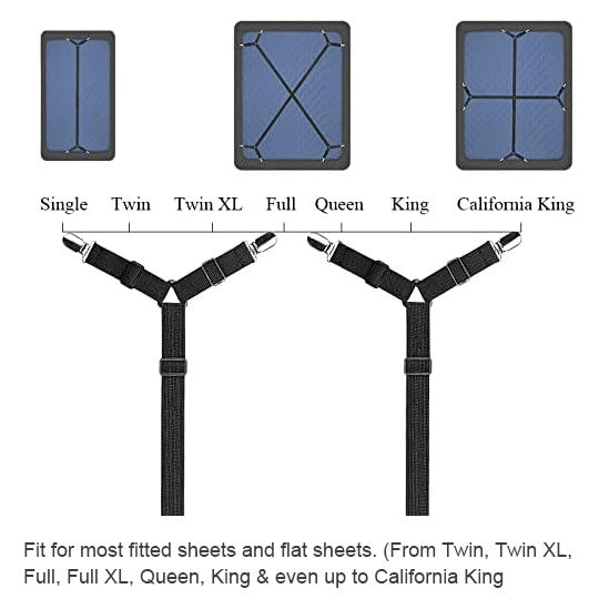Adjustable bed sheet suspenders buckle: Use the buckle to lengthen or shorten the bed sheet corner holders based on your sheet size. Adjust the bed sheet garters to fit your personal needs.