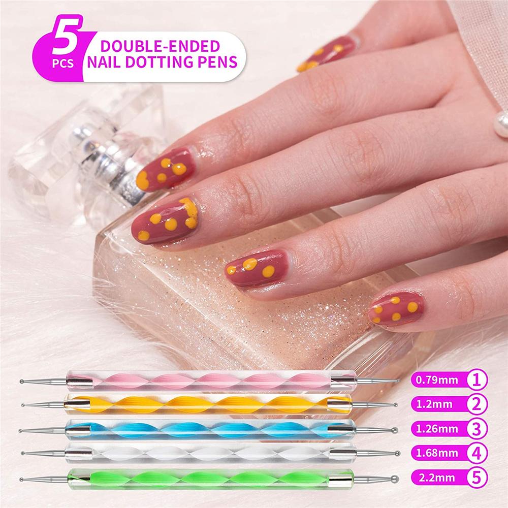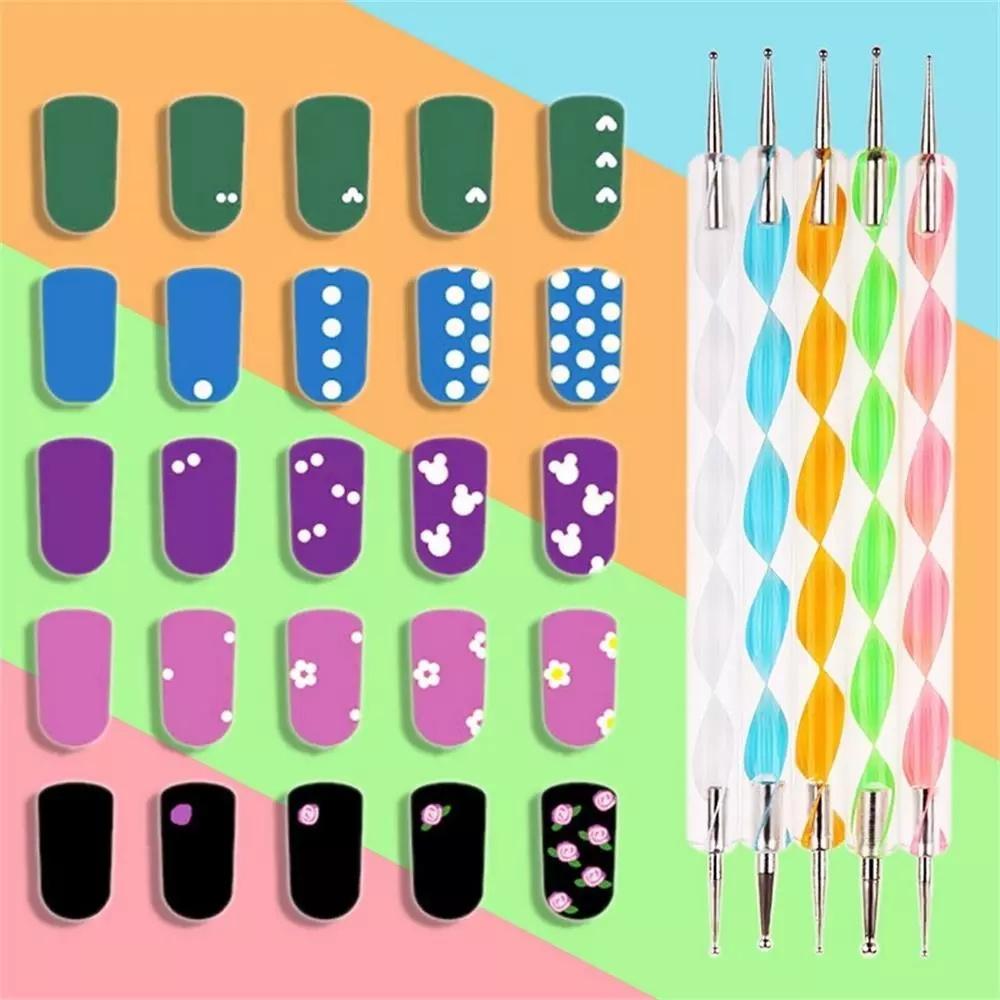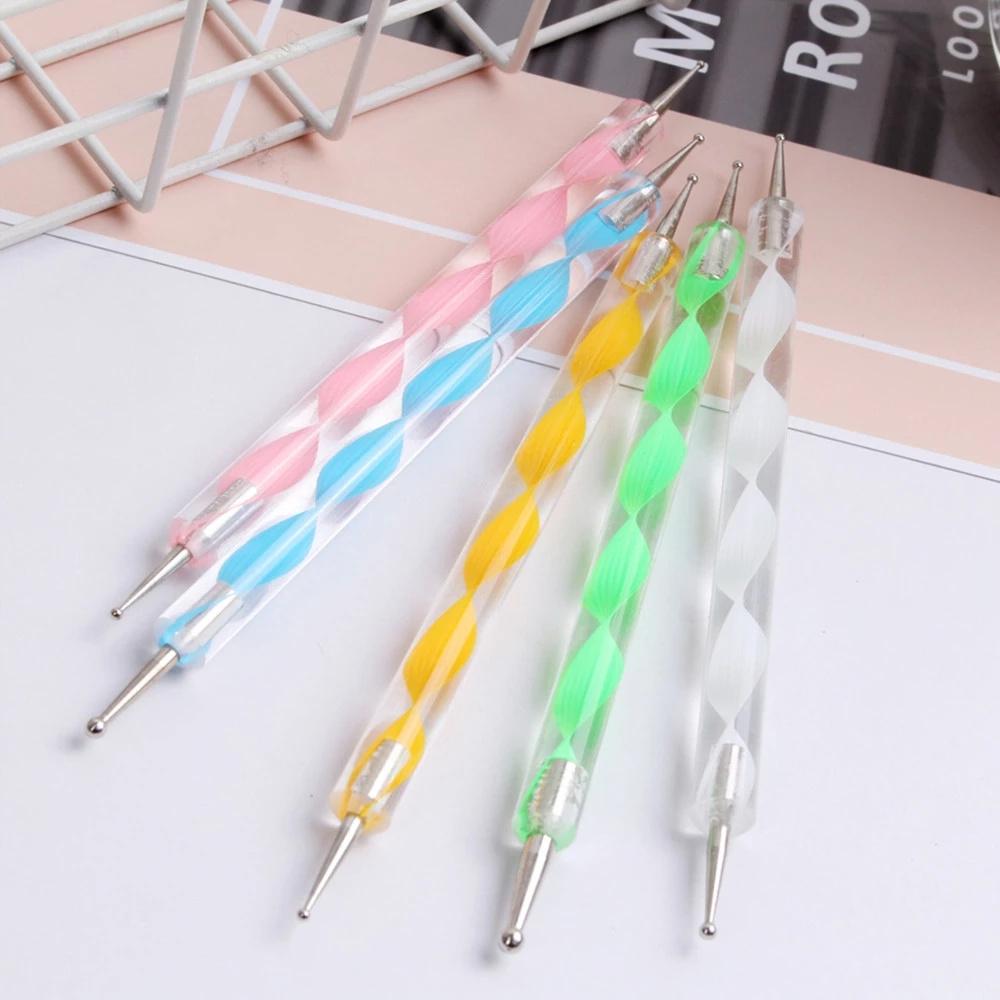 Set of 5pcs nail art dotting tools with 2 ends each: One end with a larger ball and another end with a smaller ball for various marbleizing and dotting work, it can also be used for creating dots - of an even or decreasing size - and to pill dots into petal shapes when doing finely detailed flowers.
