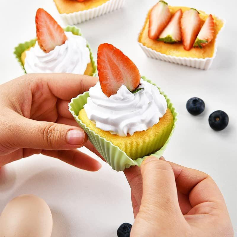 Package Includes - 8 × Rectangular Silicone Baking Cups & 8 × Round Silicone Baking Cups & 8 × Square Silicone Baking Cups in different colors. Total 24 pieces. 3 shapes of cupcake liners, allow you to make cupcakes in different shapes according to your preferences, making your muffins, cakes, biscuit and pastries more attractive and impressive
