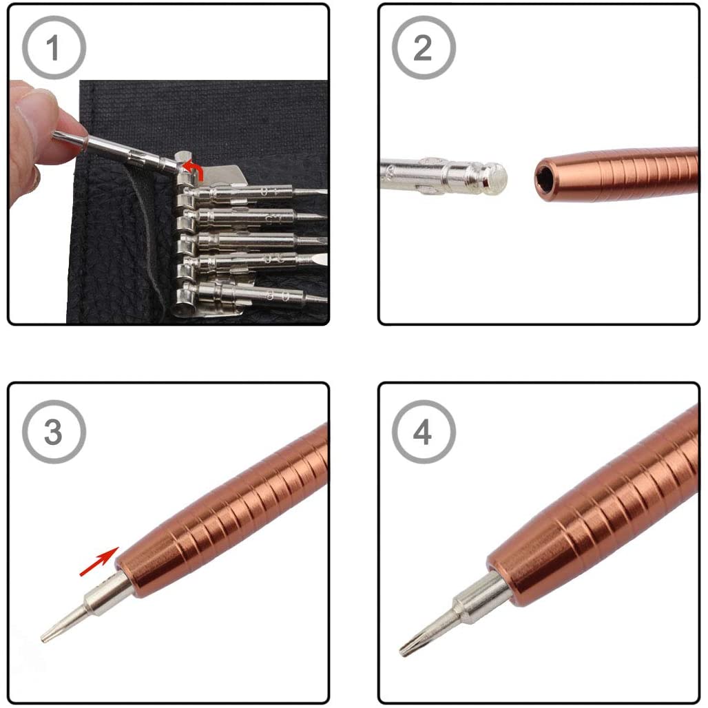 Product specifications: The complete product includes 24 removable screwdriver heads, a small handle, plus a mini black leather case.