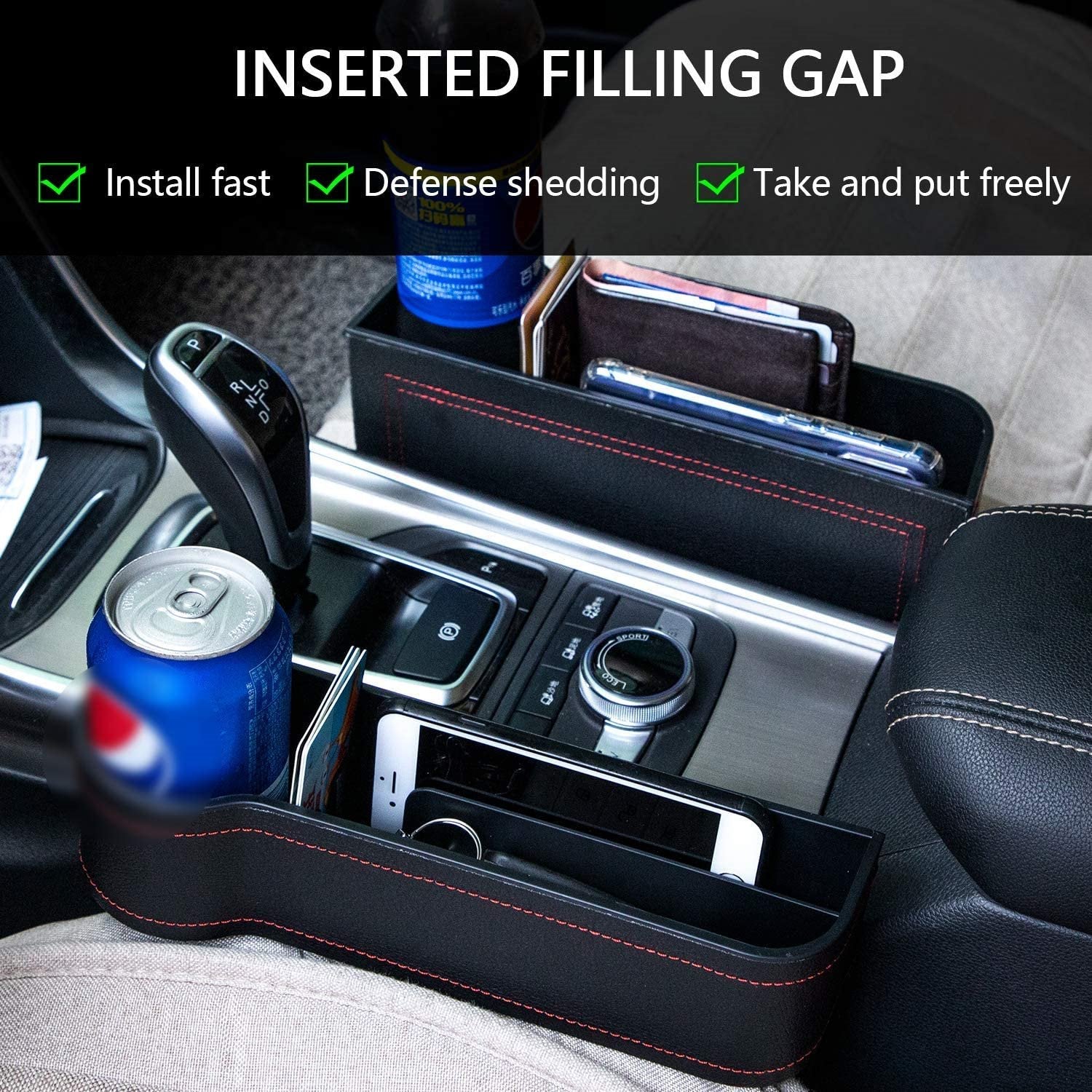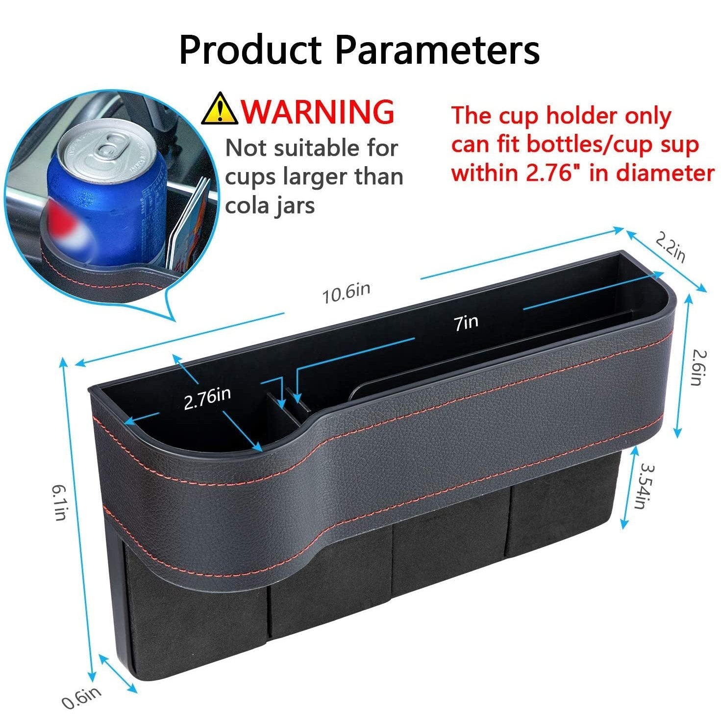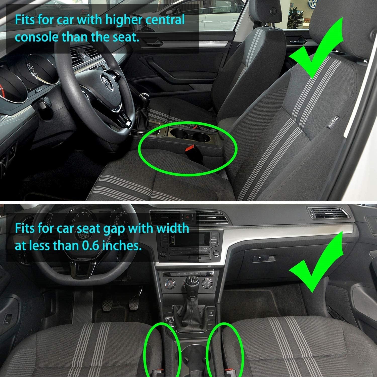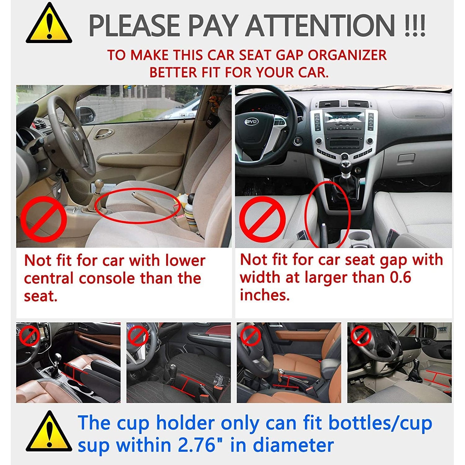 Please note: This car seat gap organizer not suitable for cups larger than cola jars. Not fit for car with lower central console than the seat. Not fit for car seat gaps with width at larger than 0.6 inches.
