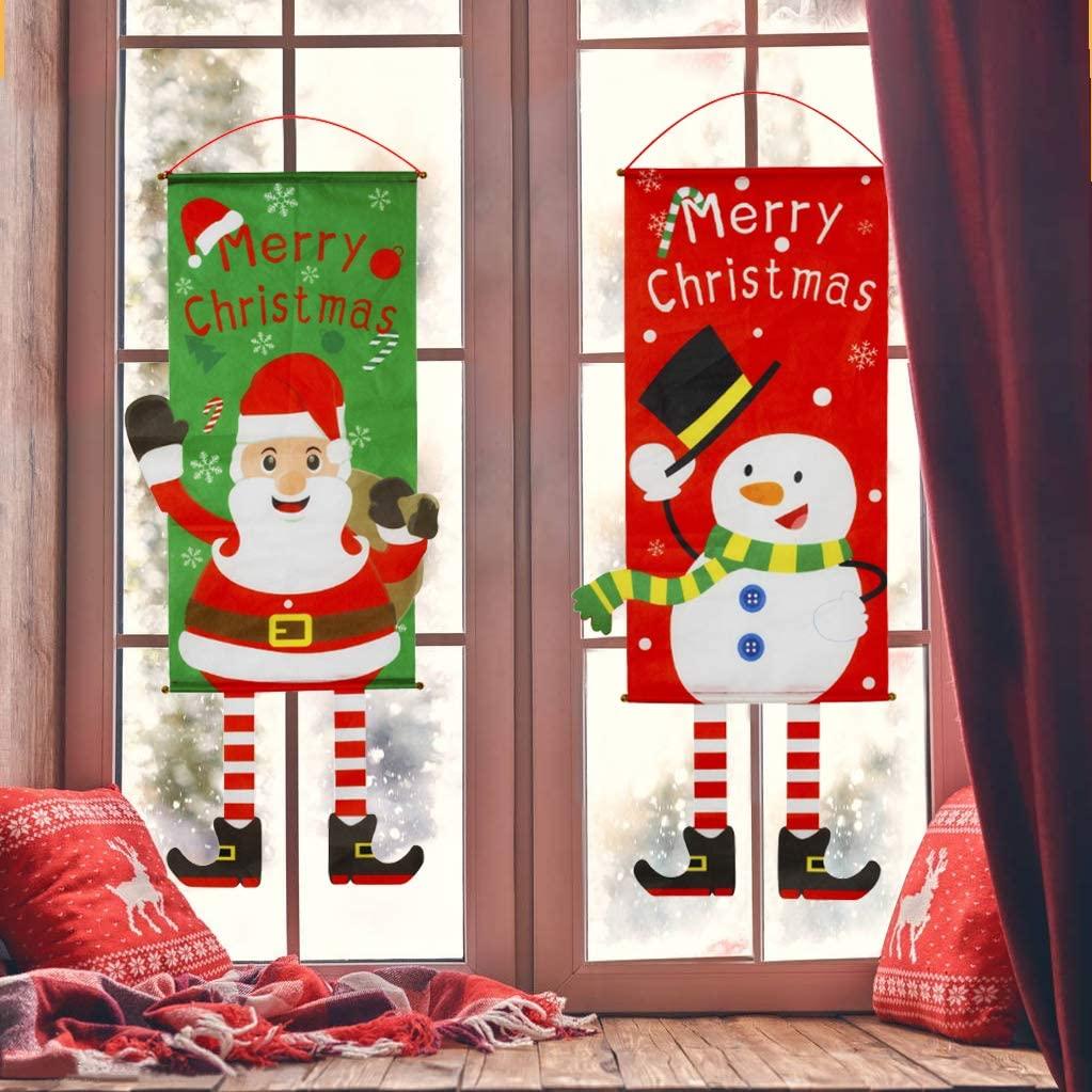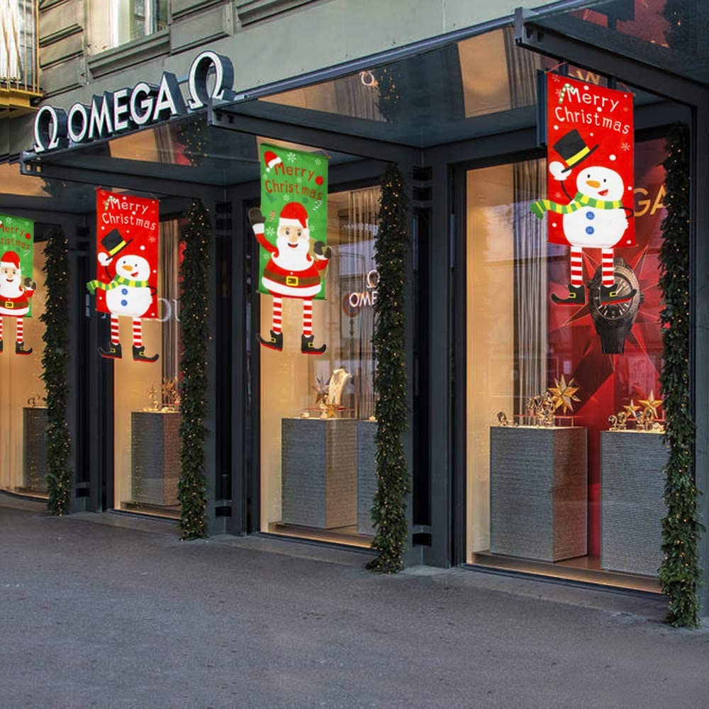 Santa Claus and Snowman hanging flag full of classic Christmas element patterns is suitable for various decoration styles.