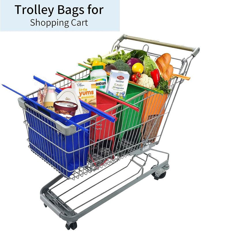 HIGH CAPACITY SHOPPING CARTS BAGS: This carts bag design is made with premium high-quality 120 gsm fabric that has been tested to hold over 50 pounds in each bag, and has a mesh bottom that ensures spills don't pool in the bottom of the bag. This set is designed to fit average-sized shopping carts.