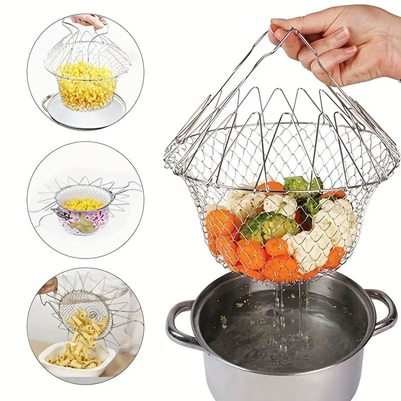 Foldable Cooking Basket is an All-in-1 nifty kitchen helper that transforms itself for dozens of everyday uses. You can use it for boiling, steaming, deep frying, rinsing, and blanching.
