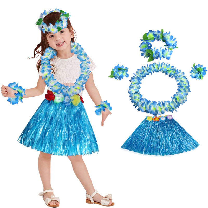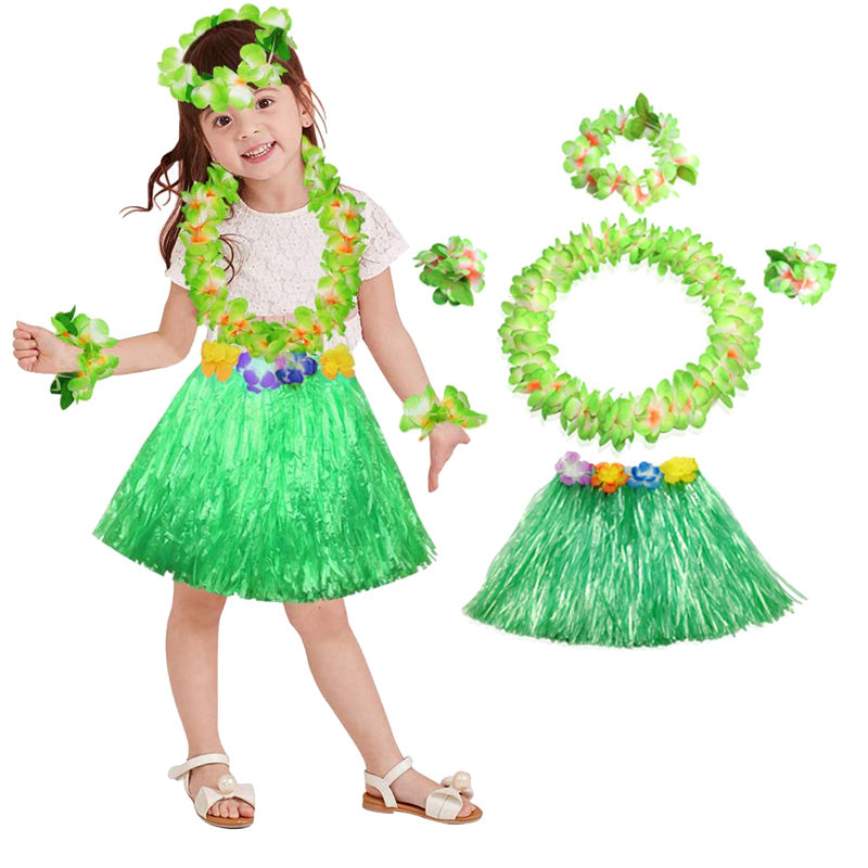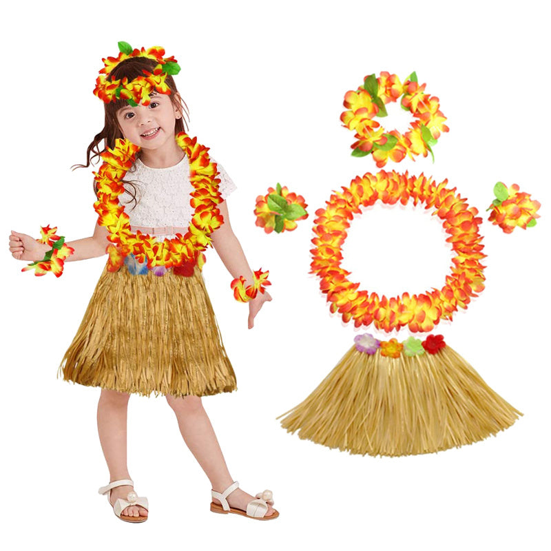 Package includes 1 x grass skirt, 1 x flower headband, 1x flower necklace, 2 x flower bracelets.