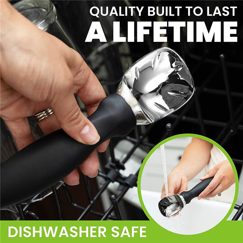 Dishwasher Safe- This handle made of thermo plastic rubber,makes the stainless steel scoop dishwasher safe to save you time and energy.This ice scoop retains its gleaming shine after dishwasher wash.And it can be hand wash too,the small ice cream scoop is very easy to clean.It’s also BPA-free and non-toxic,making it a great fit for your home and family.