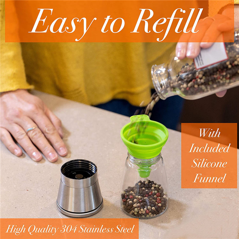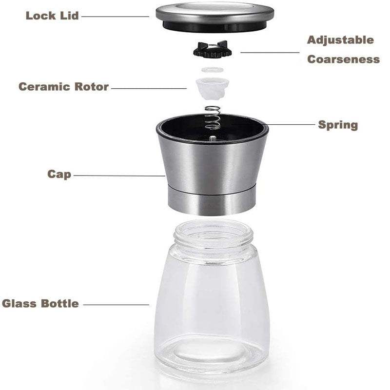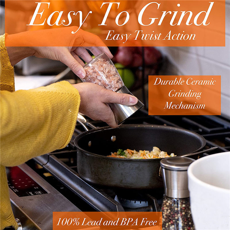 PREMIUM QUALITY – Our salt and pepper mill set have MODERN AND ELEGANT design. The brushed stainless steel grinders with high quality glass body and non-corrosive ceramic blades are perfect addition to any kitchen.