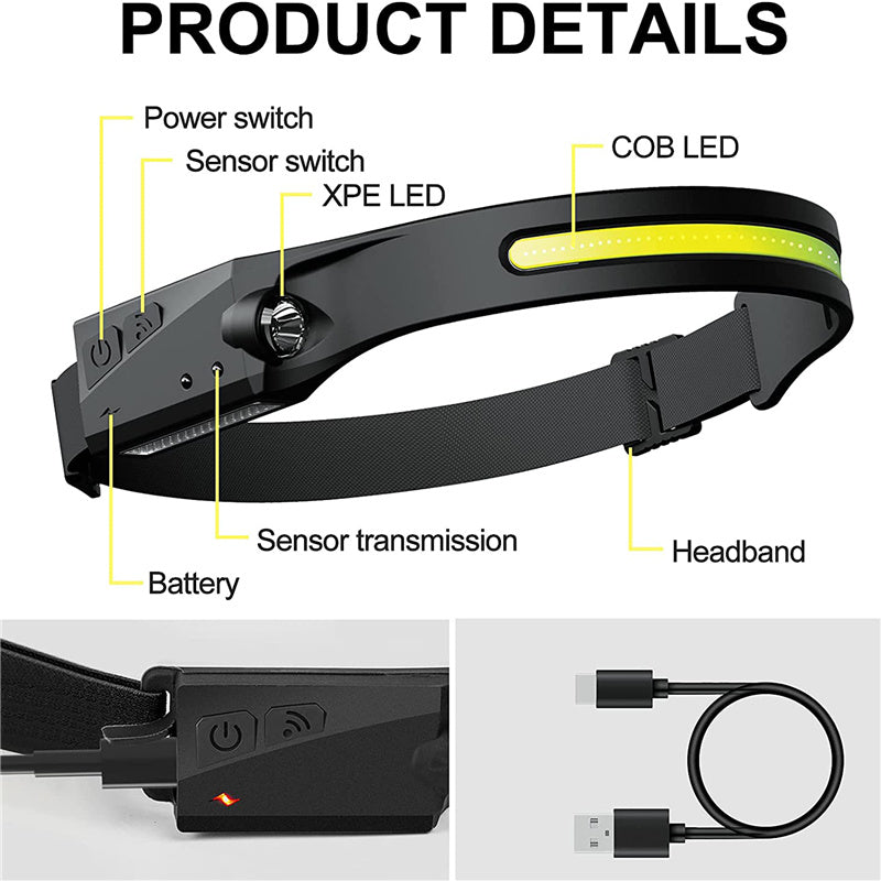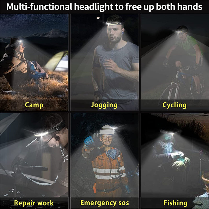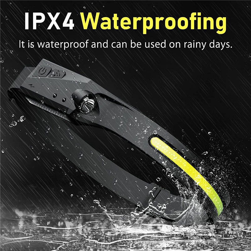 5 light modes: wide beam adopts COB: strong light and low light. Side lights adopt XPE: strong light and low light. Long press for two seconds to strobe. Super bright headlamp can adjust the brightness according to your lighting needs.