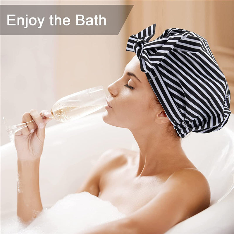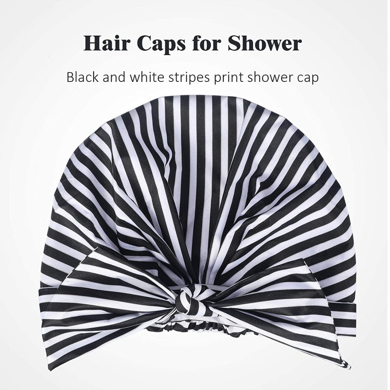 FASHION PRINT PATTERN: Shower cap with cute bow designs, can match your everyday wear and make you look more cuter. Reusable bathing hair caps excellent waterproof, prevents hair from getting wet in the shower, easy to air dry, reusable, stretchy, lightweight and portable.