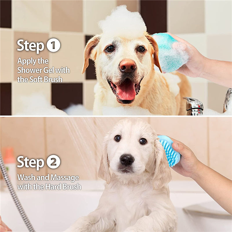 Shampoo Dispenser Brush and Massage Wash- First squeeze slightly and the shampoo can easily come out, then use the dog shower brush scrub away dirt, remove dead skin and loose fur, bring your dog a very comfortable bath and massage soothing effect.