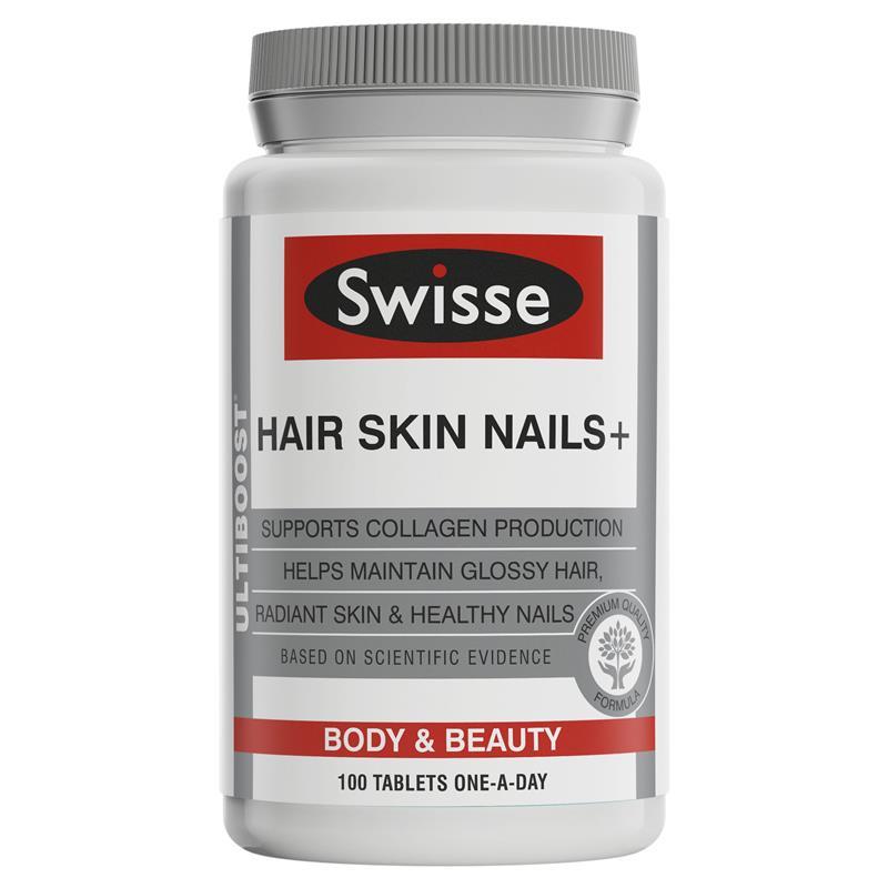 Swisse Ultiboost Hair Skin Nails+ is a premium quality beauty formula with vitamins and minerals specifically formulated to support collagen production and assist in the maintenance of glossy hair, radiant skin and healthy nails.
