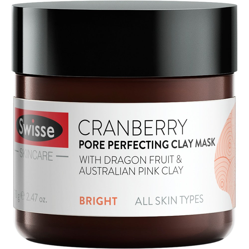 Swisse Cranberry Pore Perfecting Clay Mask is formulated with pink Australian clay for a gentle, luxurious facial treatment. It combines natural fruit acids containing AHA and BHA to clarify and purify the skin, helping to refine and tighten the pores for a clear, smooth complexion.