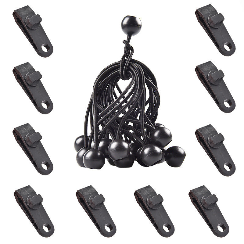 SIZE & PACKAGE INCLUDED - 10 pcs of tarp clips (8 x 3 x 2.5 cm) + 10 pcs of bungee cords (15 cm). Material: Tarp clips made of Nylon/Polyamide, Bungee made of rubber band and PA, Carabiner made of aluminium alloy.