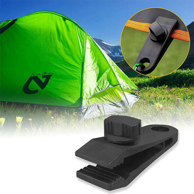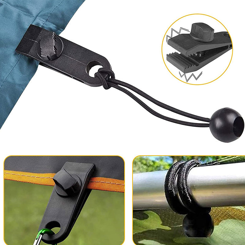 WIDE USE - Our tent clamps are ideal for holding up tarp, boat cover, pool cover,swimming pool covers,canopy,bike cover, car cover etc.Also can work as tent clamps, tarp tie down clips, tarp holders, tarp fasteners, tarp clips with bungee, car cover clamp. Use as tarp clips camping, tarp ball bungee cords,shark tarp clips,large tarp clips,cover clamps,camping awning clips.