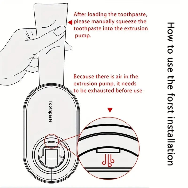Important Notes: For the first time using this product, squeeze the toothpaste body after installing the toothpaste squeezer, then press the button several times to remove air from the toothpaste dispenser until the toothpaste flows out of the nozzle.