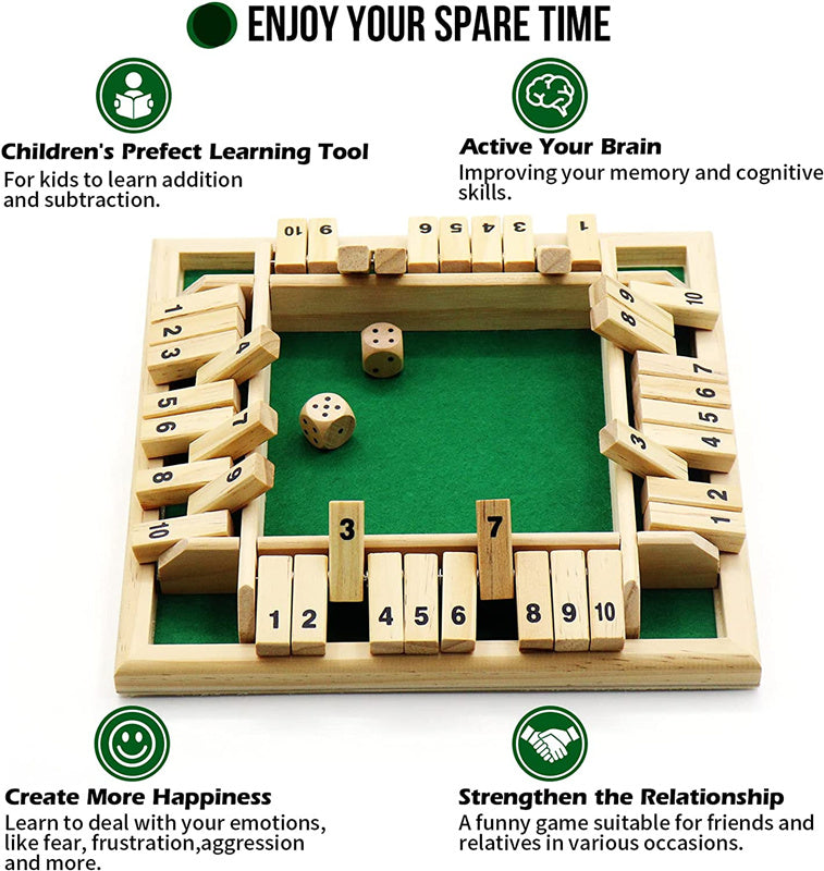 CUSTOMED RULES: Each board prints number clearly, each player owns 10pcs of board number from 1 to 10; roll the dice and lay down tiles that match the sum of the roll dice numbers . In addition, you can customize the detailed rules of the game.